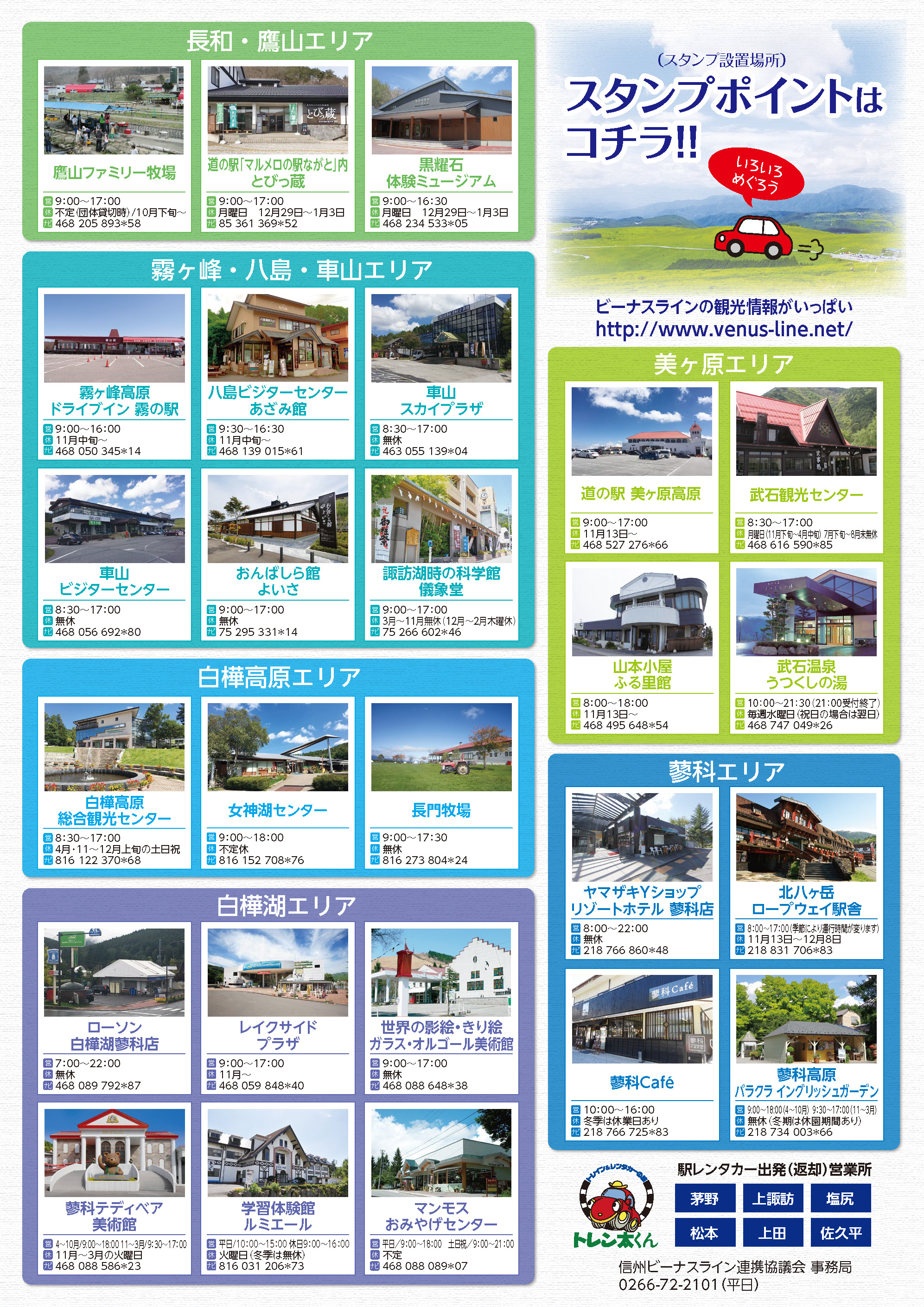 Utsukushigahara / Takeishi area Wada / Himekidaira / Takayama area Kirigamine / Yashima / Kurumayama area Lake Shirakaba / Lake Megami area Tateshina area Surrounding area